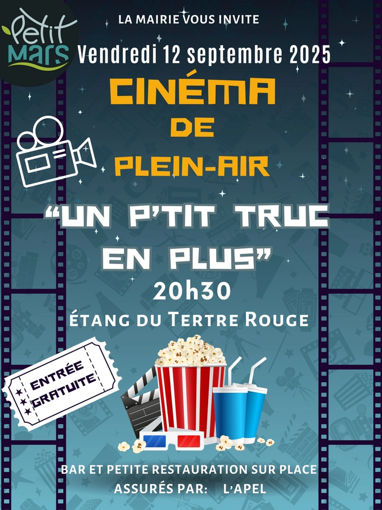 Demain soir, vendredi 12 septembre, la commune de Petit-Mars vous donne rendez-vous pour un moment convivial et festif : le cinéma de plein air revient au plan d’eau du Tertre Rouge !