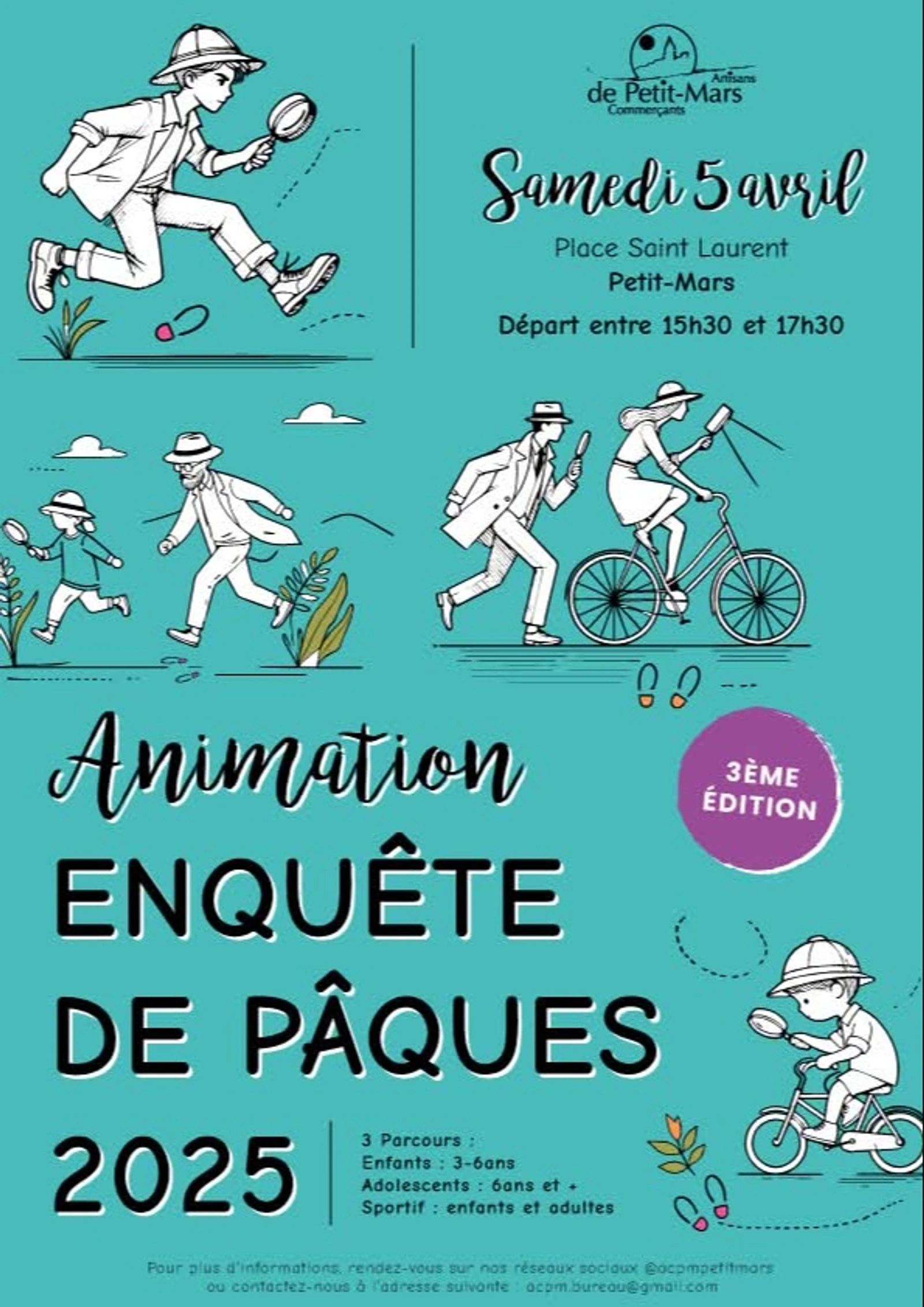 L'Association des Commerçants et Artisans de Petit-Mars (ACPM) est ravie de vous convier à la troisième édition de son Enquête de Pâques.